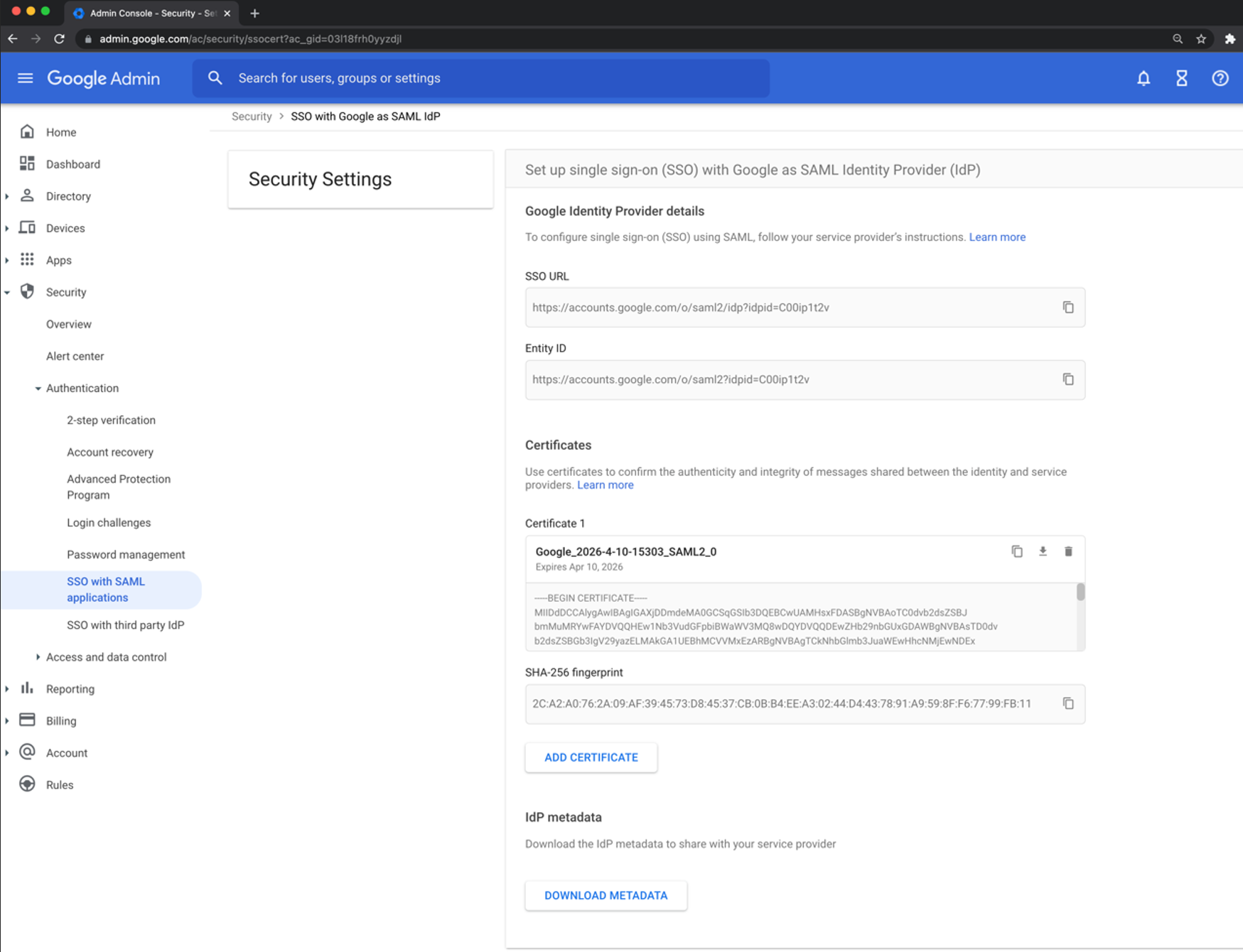 - Please note SSO URL, and Entity ID and download certificate or Download Metadata file.