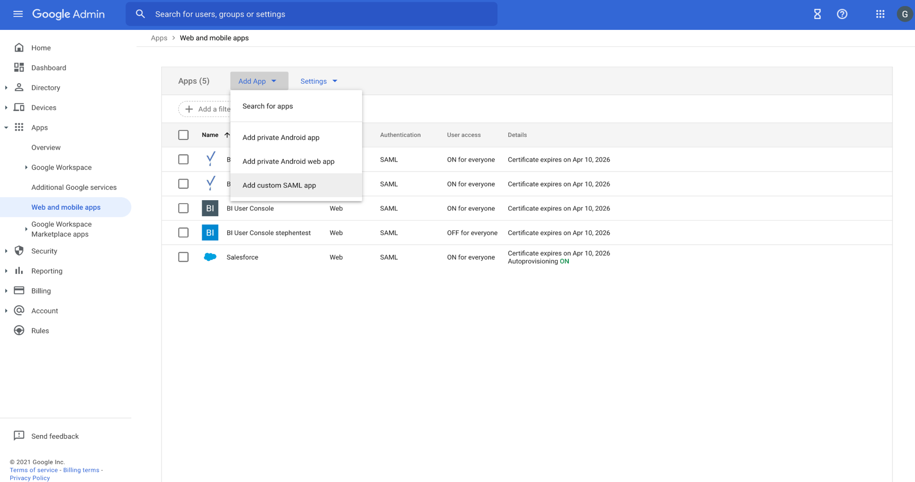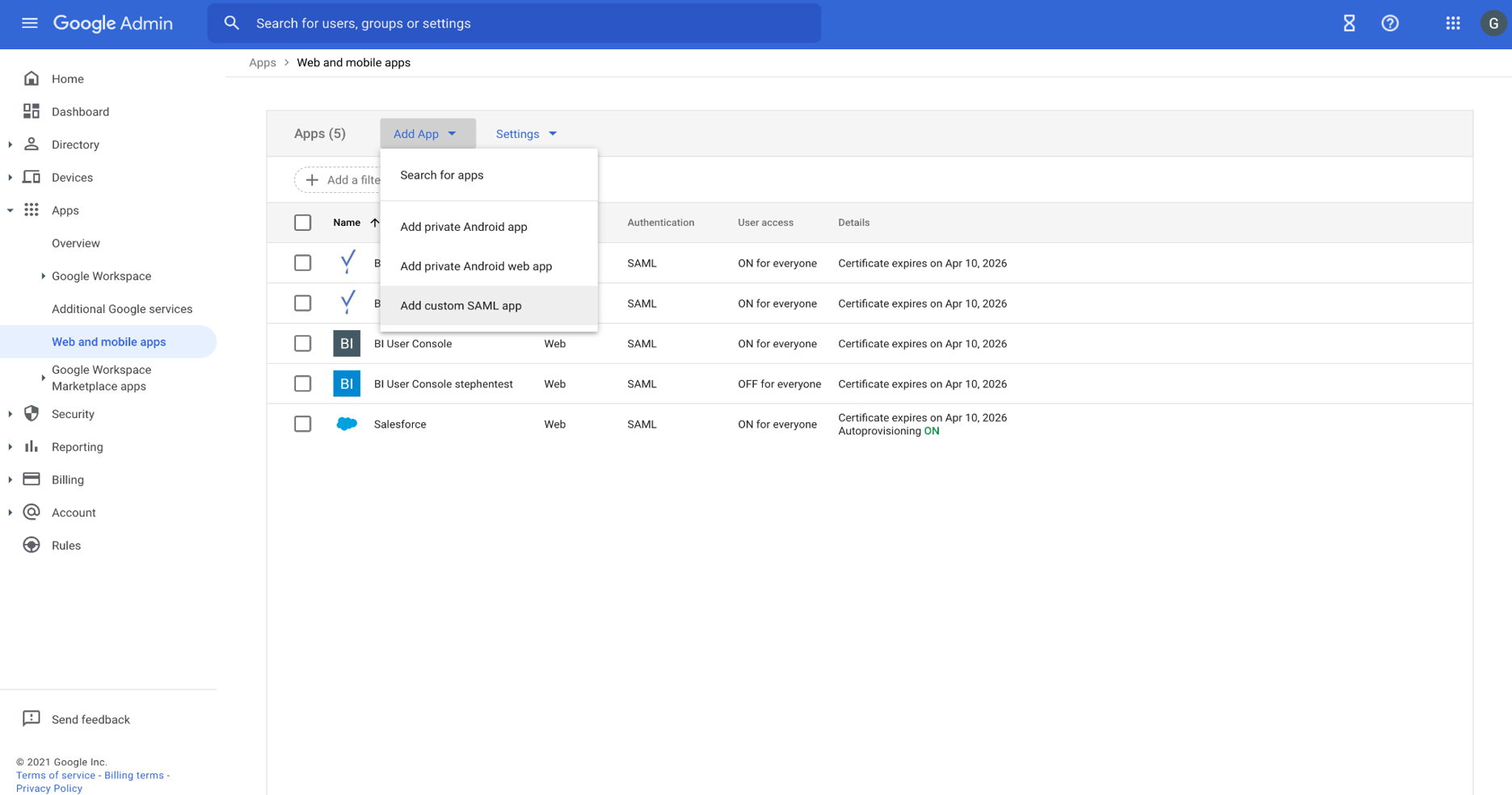 - On the homepage of the Google Workspace Admin console, select Apps > Web and Mobile Apps