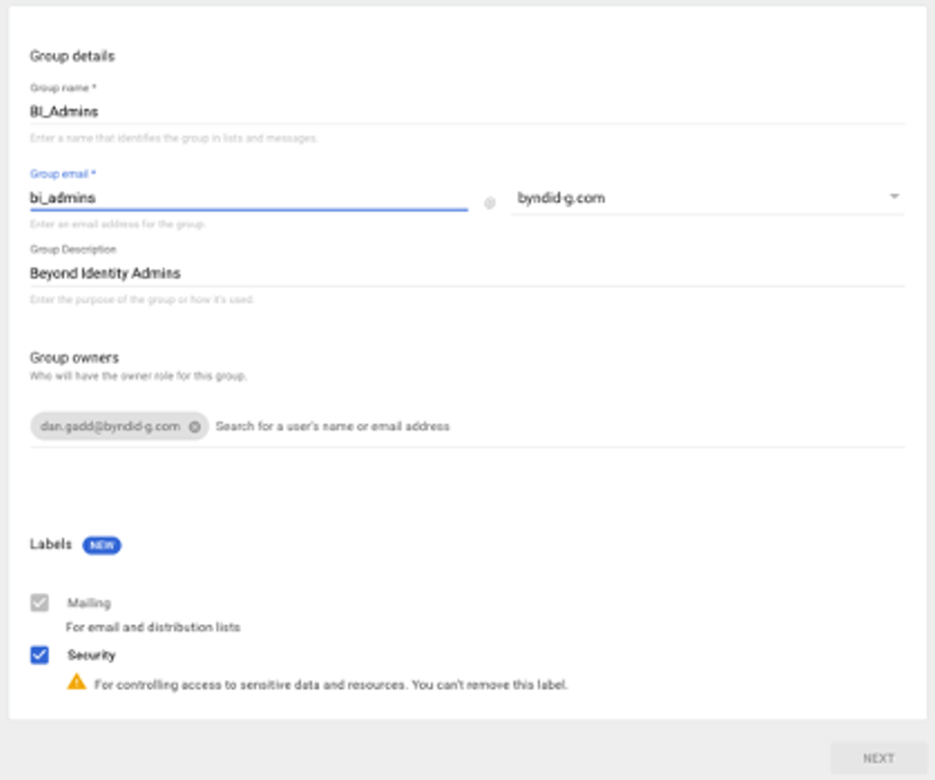 - Create a new Beyond Identity Admins group by selecting the following parameters.