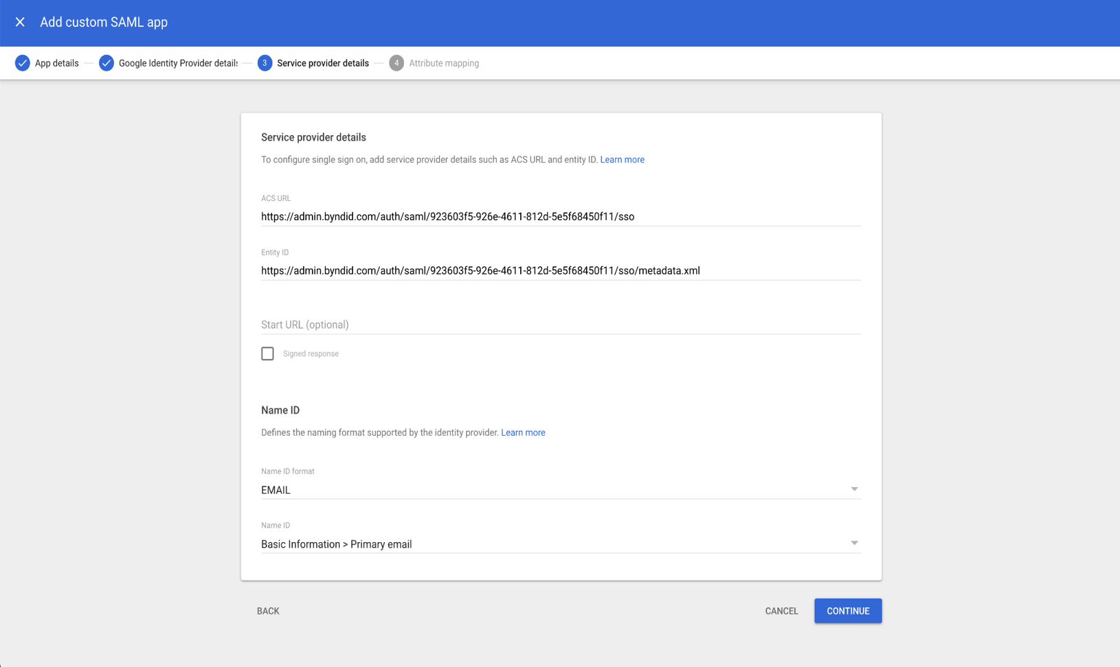- Entity ID: (e.g. https://admin.byndid.com/auth/saml/<Connection-ID>/sso/metadata.xml) Enter value provided by Beyond Identity Field team.