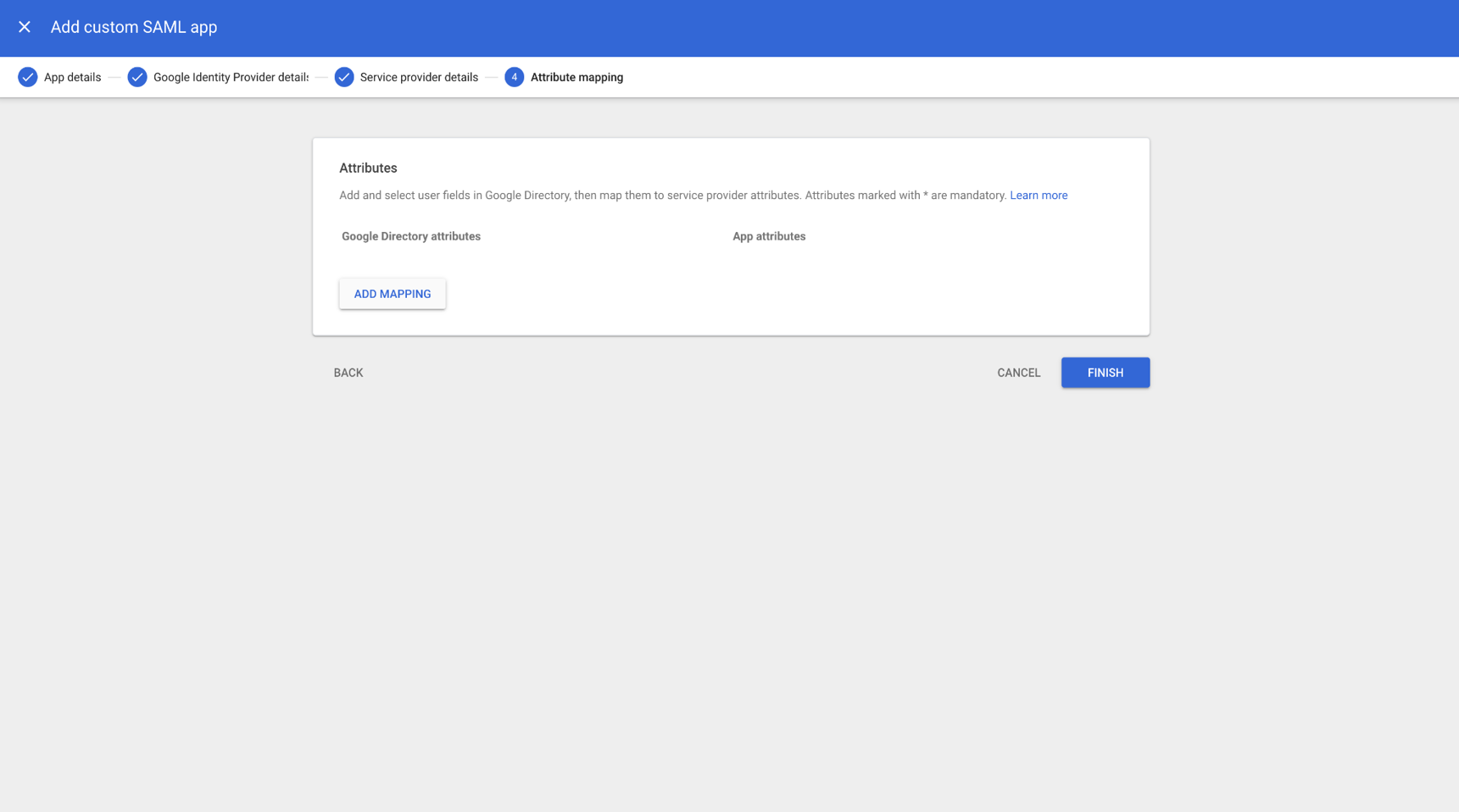 - On the “Attribute mapping” tab Select ‘Finish’. There is no need to map any attributes