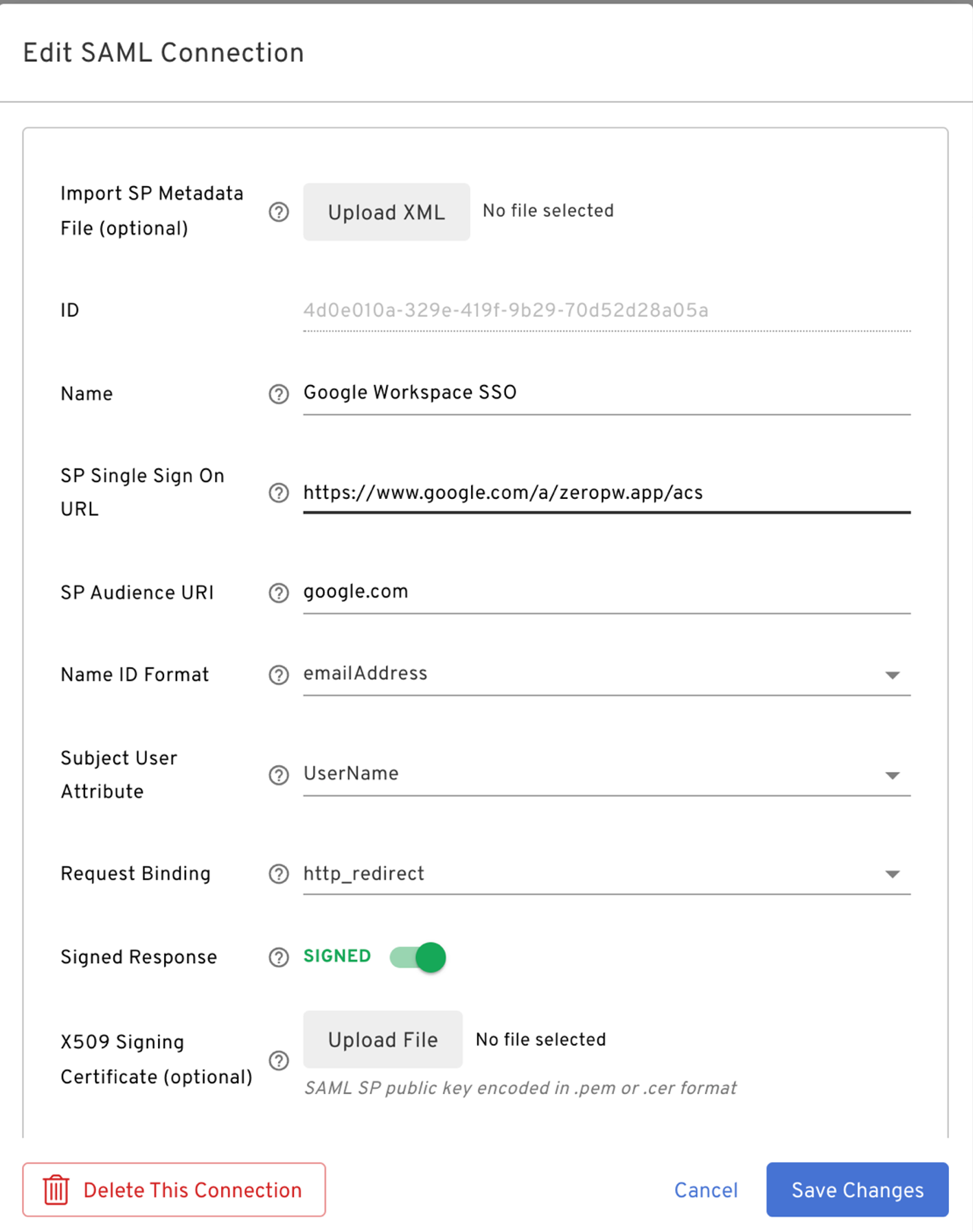 - IdP Entity Id: https://accounts.google.com/o/saml2?idpid=xxxx (Provided by the customer as Entity ID)