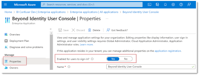 Navigate to Azure Directory > Enterprise Applications > Beyond Identity User Console > Properties and verify that the Enabled for users to sign-in is set to Yes.