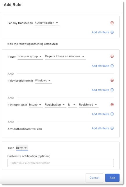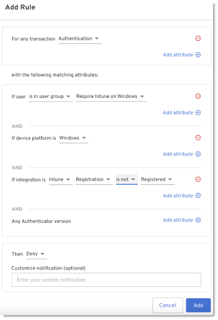 Option Value For any transaction Authentication If user is in user group > "Require Intune on Windows" If device platform is Windows If Integration is Intune > Registration > is > Registered Then Deny - Click Add.