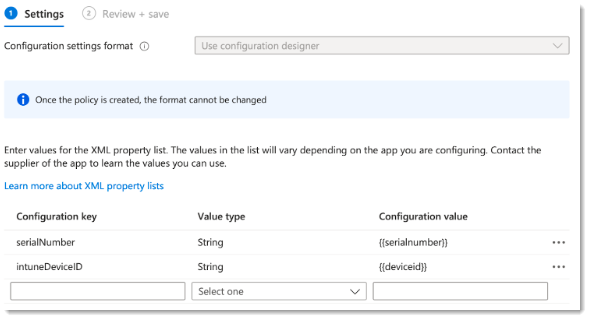 Configuration key Value type Configuration value serialNumber String {{serialnumber}} intuneDeviceID String {{deviceid}}