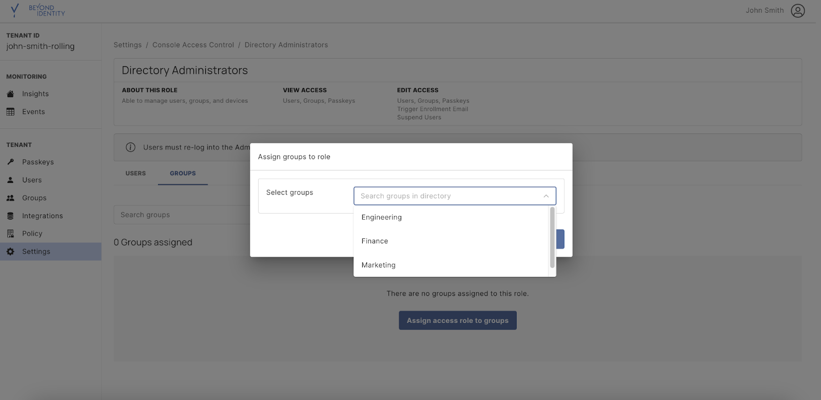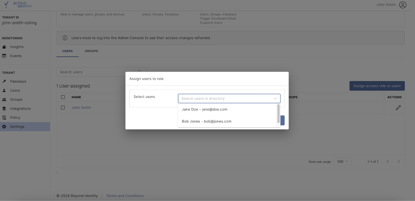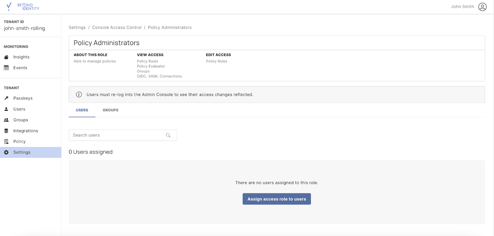 Beyond Identity provides role-based access control (RBAC) functionality in the Admin Console. RBAC allows a tenant administrator to grant access to certain Admin Console features to different users based on predefined roles.