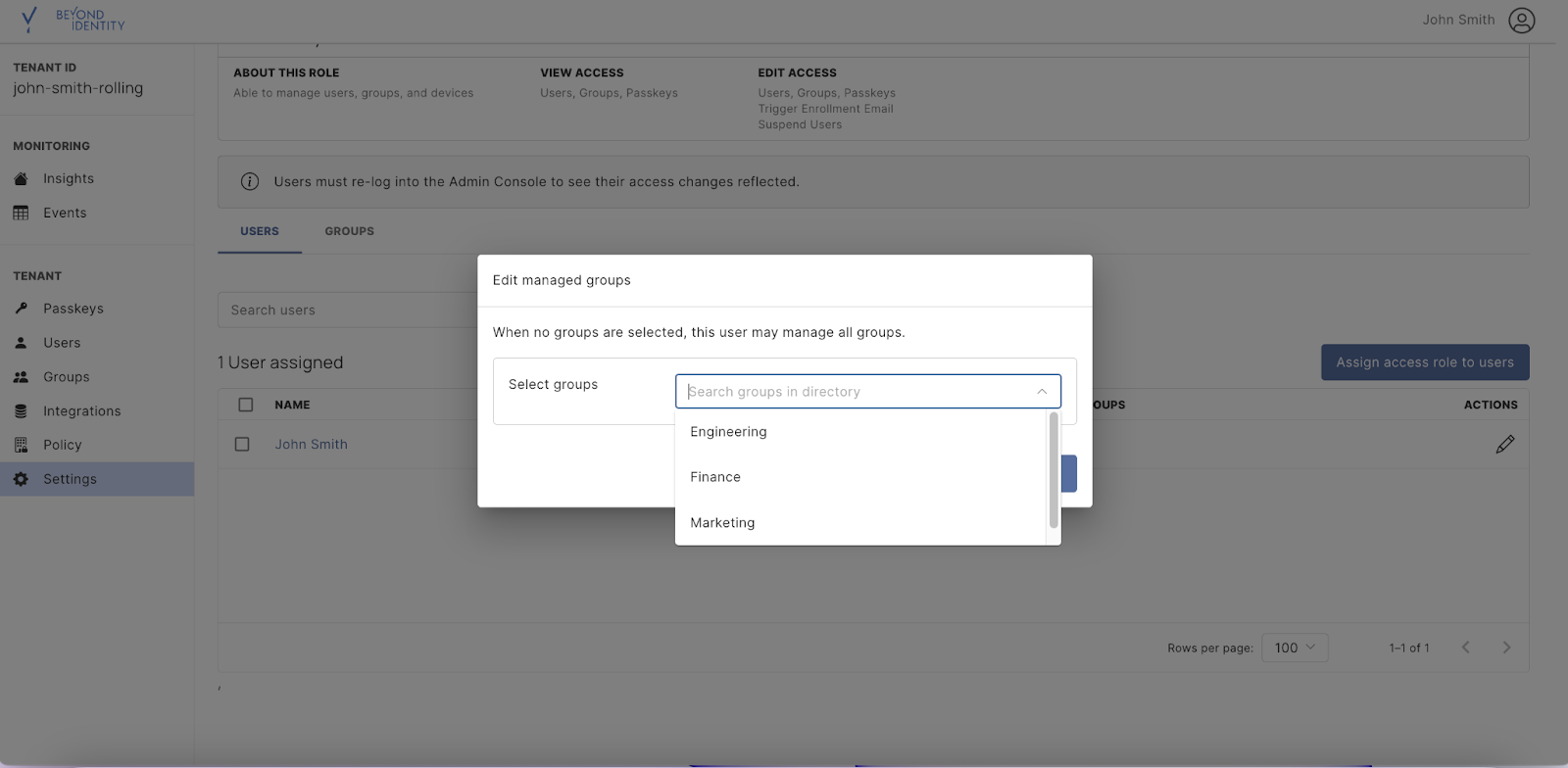 For example, if your organization has three user groups, Engineering, Finance, and Sales, and you assign an admin to manage only the Engineering group, that admin can only view and manage users within the Engineering group.