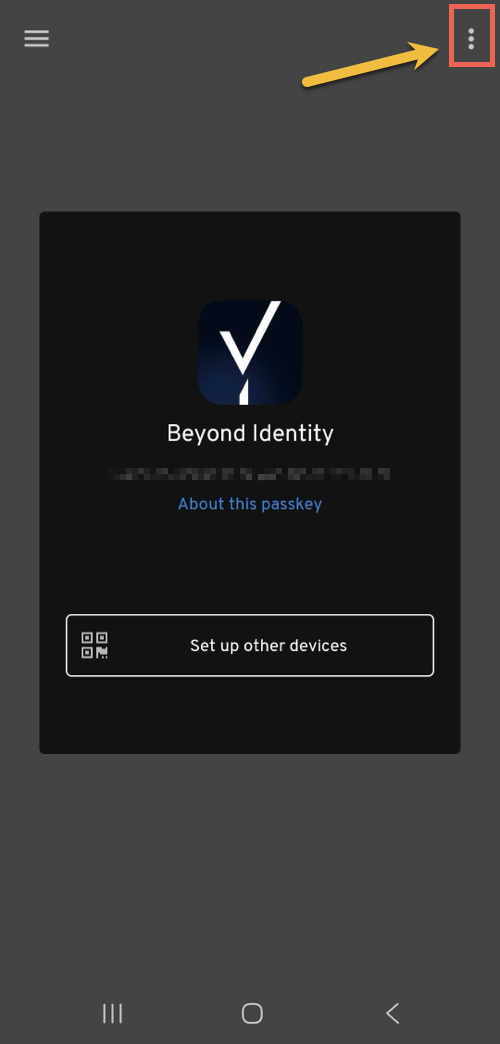 In your Android device, open the Beyond Identity Authenticator app, then tap the three dots on the left side of the screen.