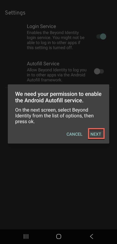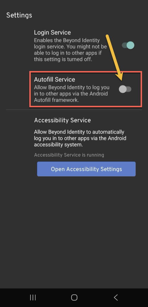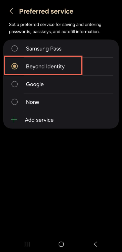 5. Select Beyond Identity as your preferred service.6. Tap the back button to the Settings screen to confirm the Autofill Service toggle is on.