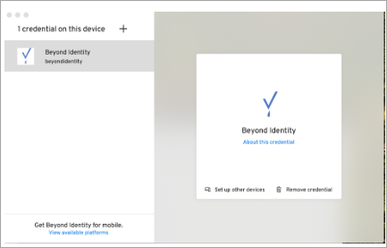 - By clicking on Step 2 “Register New Credential”, the user’s credential will get enrolled in the Beyond Identity service on the back end. On the front end, users who click Step 2 will be taken to the Beyond Identity Authenticator where they will see the progress of their credential registration. Once completed, the user will see the credentials in the Authenticator.