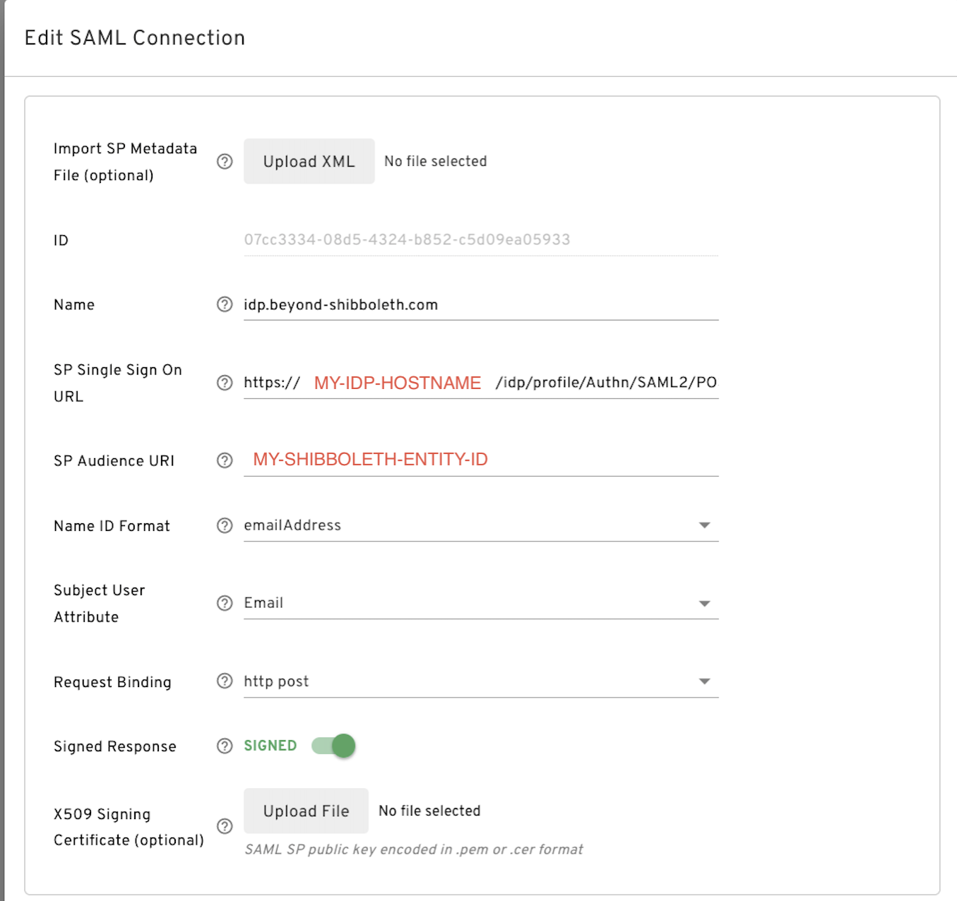 SP Single Sign On URL: https://${MY-SHIBBOLETH-HOSTNAME}/idp/profile/Authn/SAML2/POST