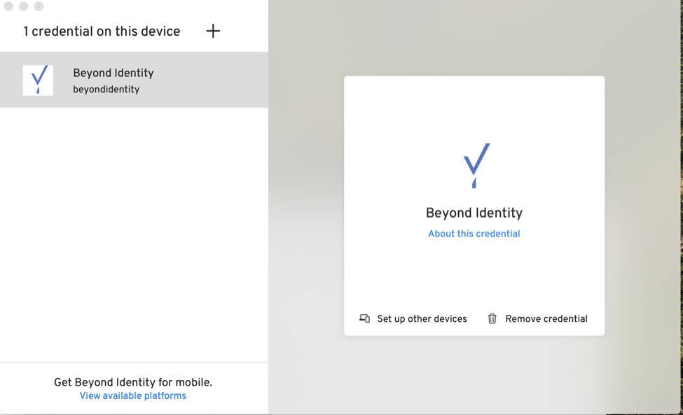 - By clicking on Step 2 “Register New Credential”, the user’s credential will get enrolled in the Beyond Identity service on the back end. On the front end, users who click Step 2 will be taken to the Beyond Identity Authenticator where they will see the progress of their credential registration. Once completed, the user will see a credentials in the Authenticator.