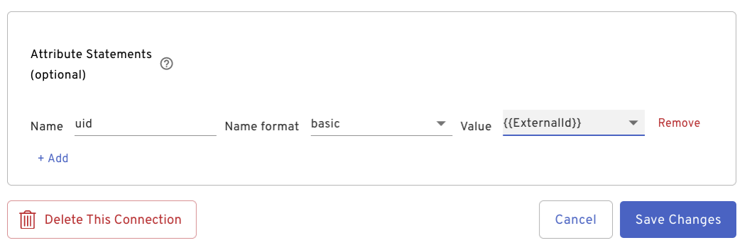 Under the Attribute Statement, add uid with a Name format of basic, and map from either: {{Email}} or {{ExternalId}} — whichever is mapped to uid on the Shibboleth directory instance.