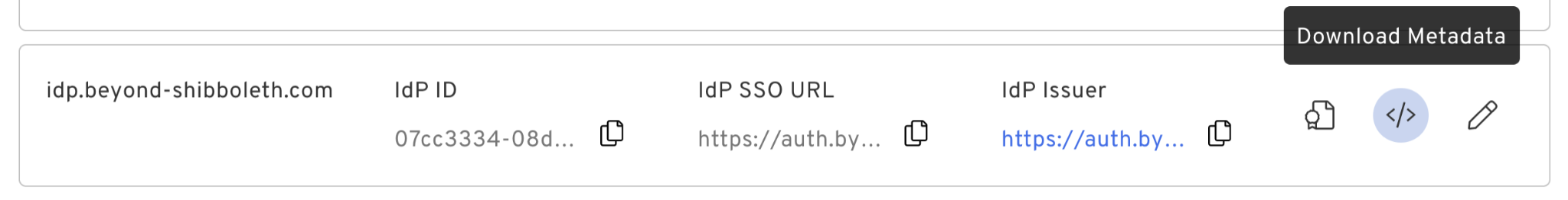2. Save Changes then click on the </> Download Metadata button and save the metadata file to ${idp.home}/conf/idp-beyond-identity-metadata.xml on the Shibboleth instance.