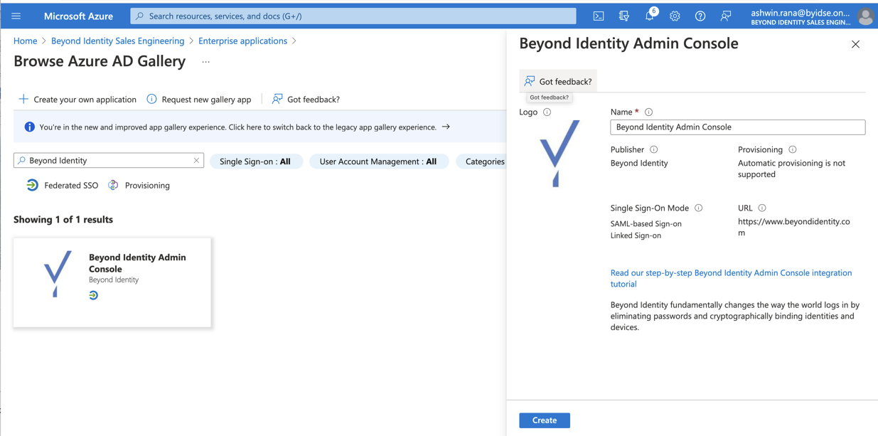 - Search for “Beyond Identity” from the top menu bar and select “Beyond Identity Admin Console” App from the App Gallery. Click on “Create” to instantiate this app.