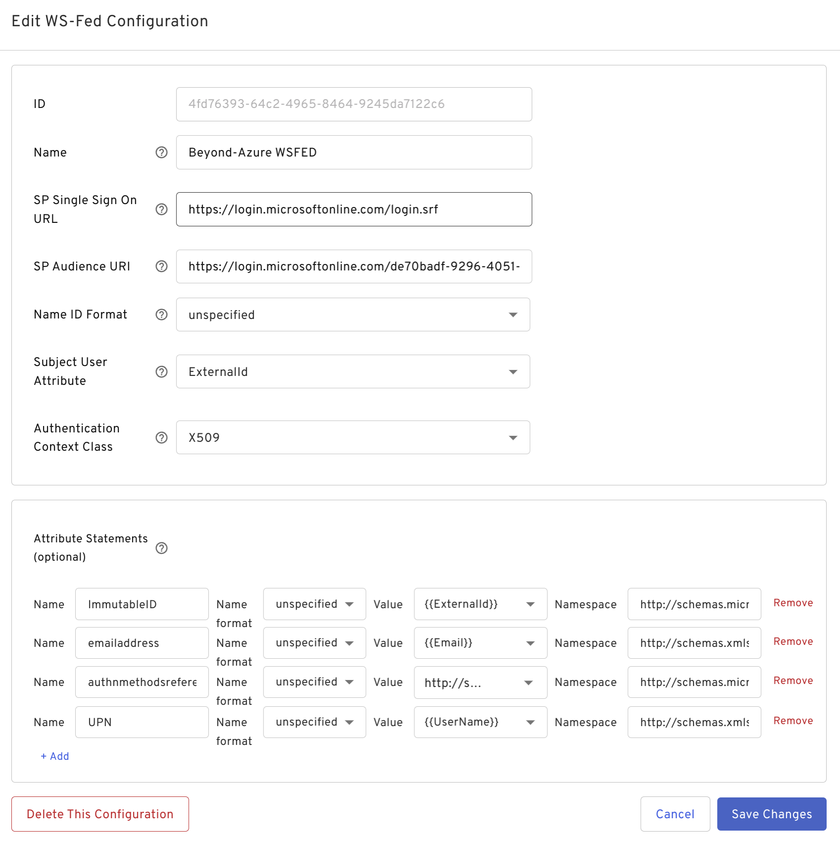 - SP Audience URI: urn:federation:MicrosoftOnline