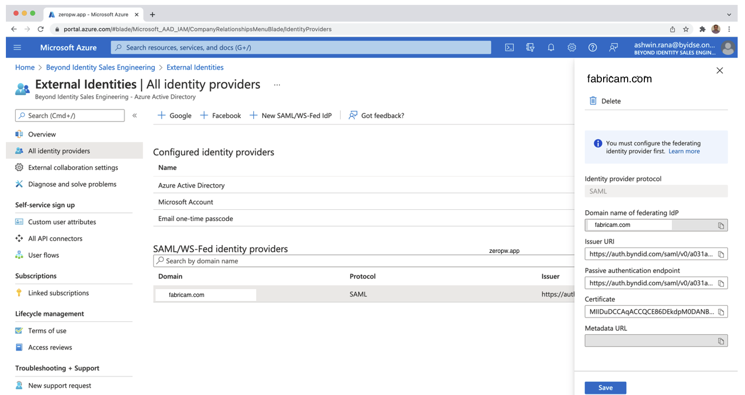 - Set up Beyond Identity as the external identity Provider in Partner’s Azure AD tenant.