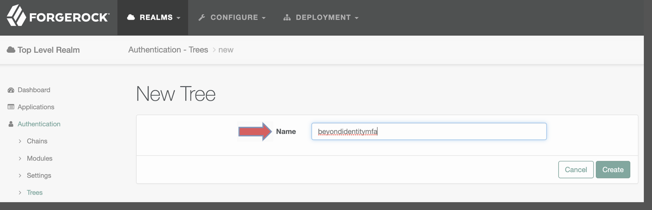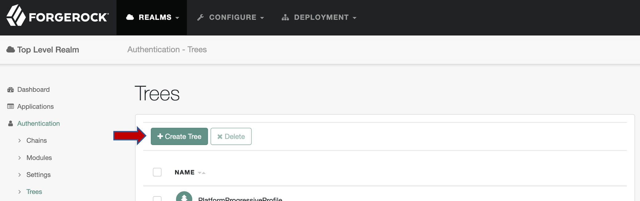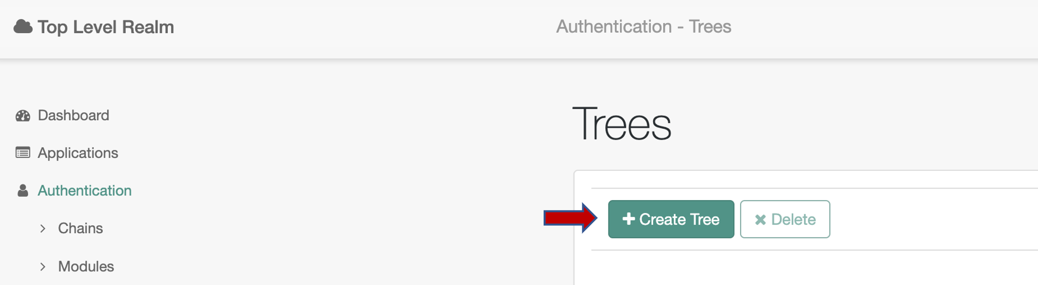 Authentication Trees defines the authentication workflow from start to finish. Create an Authentication Tree by navigating to “Authentication=>Trees” in AM console.
