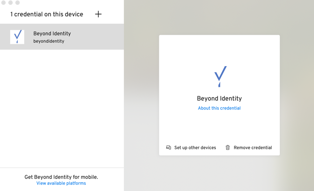 - By clicking on Step 2 “Register New Credential”, the user’s credential will get enrolled in the Beyond Identity service on the back end. On the front end, users who click Step 2 will be taken to the Beyond Identity Authenticator where they will see the progress of their credential registration. Once completed, the user will see the credentials in the Authenticator.