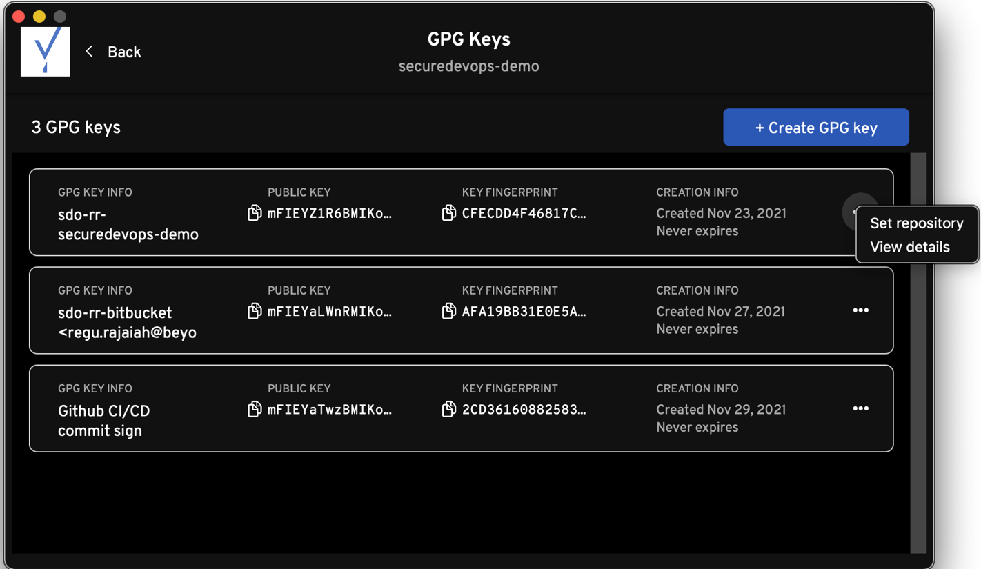 - In the authenticator, click the ellipses to the right of the GPG key and choose Set repository.