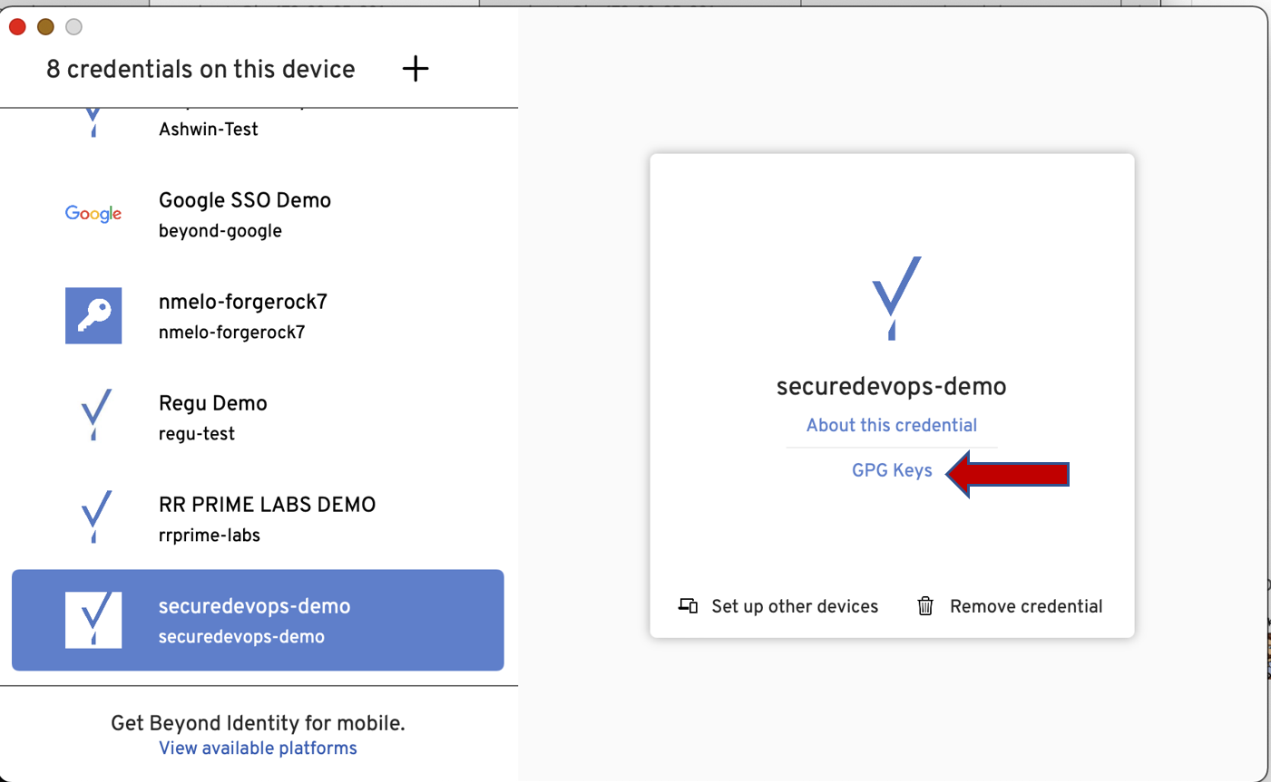 - On the Beyond Identity platform authenticator, click the GPG Keys link.