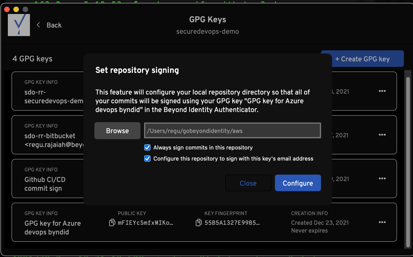 - A GPG key generated on the Beyond Identity Authenticator can be used to sign many repositories, but a repository can be signed with only one key.