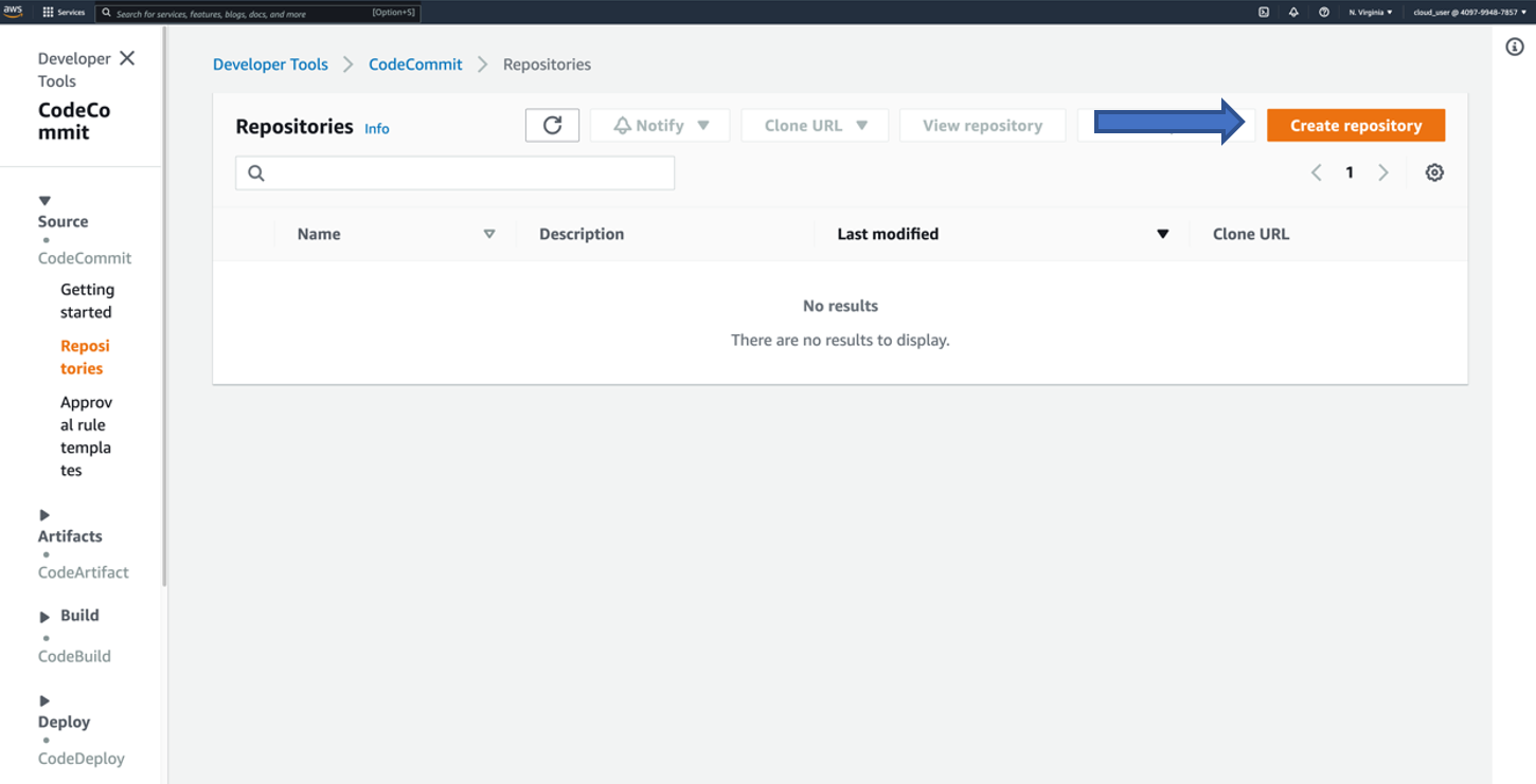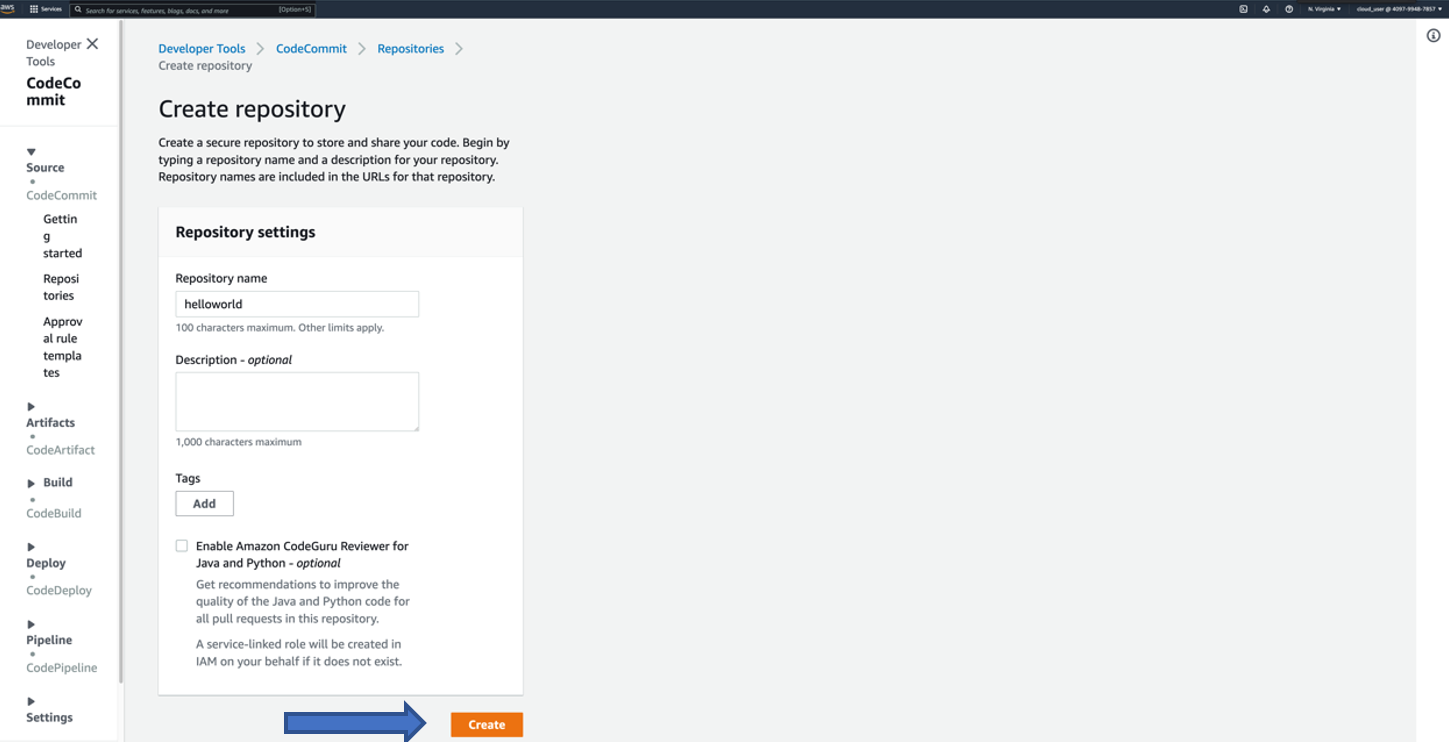 - Click Create repository to create a code repository with AWS CodeCommit.