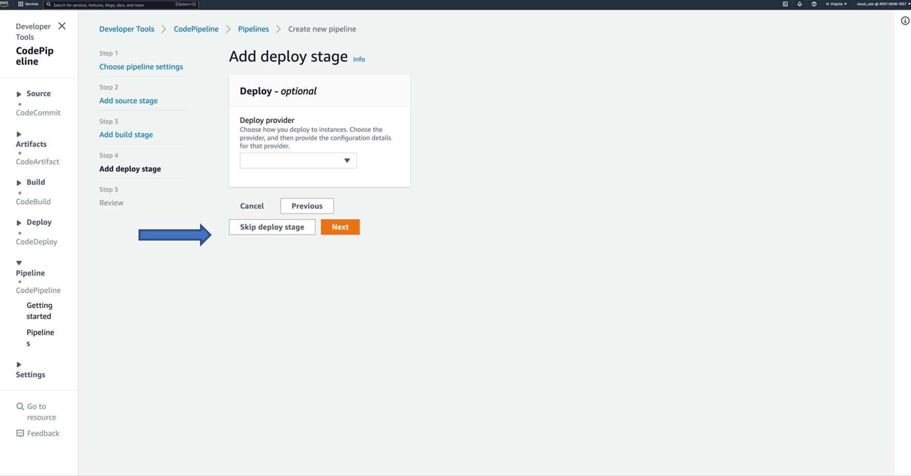 - Choose Deploy skip stage.
