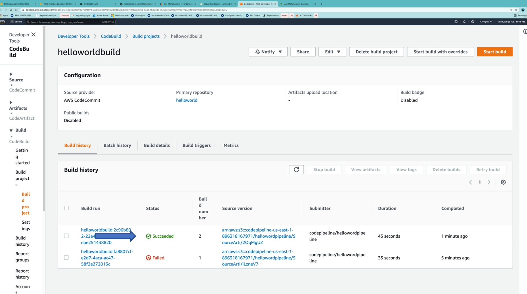 - Check Build history on AWS CodeBuild. You should see the job “succeeded”