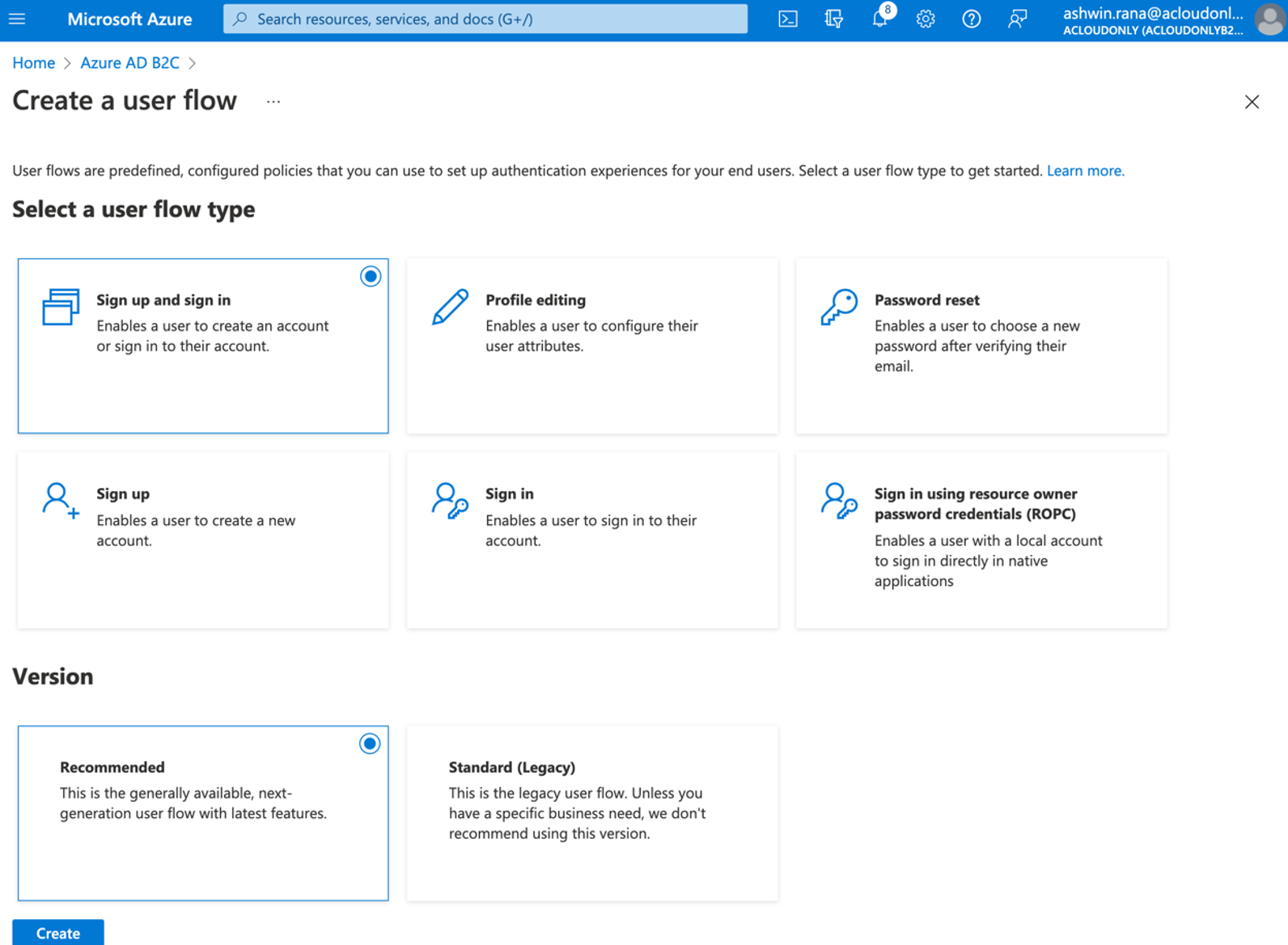 - Select a user flow type by clicking on appropriate flow type (e.g. “Sign up and sign in” and version to “Recommended”) as shown below.
