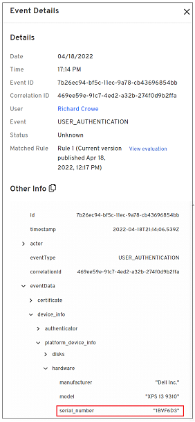 - The Event Details are displayed in the upper-right corner of the Events page. Confirm the serial number for the device has been captured by locating the serial_number under eventData > platform_device_info > hardware that is found under the Other Info section.