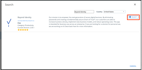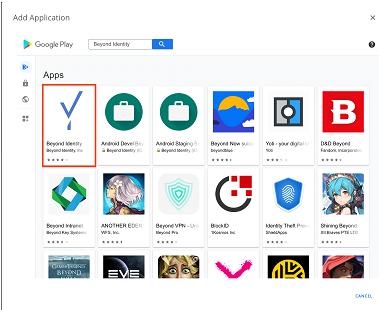 - A list of applications will come up, choose the Beyond Identity Application with the Blue logo as shown below: