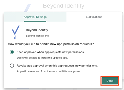 - Next, Workspace ONE will ask for permission to Keep Approved state if permissions change. Review this choice per your organization’s policies and click Done.
