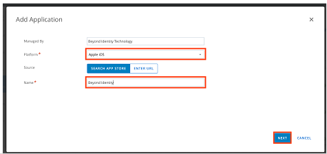 - Select Platform: Apple iOS, Source: AppStore, Name: Beyond Identity. Click Next.