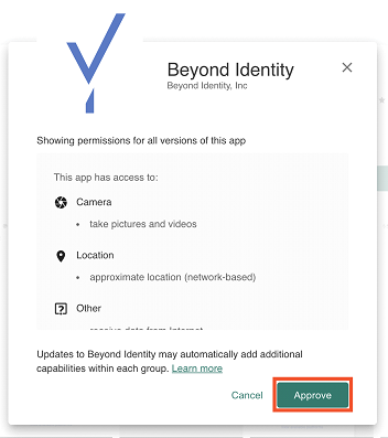 - The next screen will show which permissions the Beyond Identity application will acquire from users’ devices. Please review and click Approve.